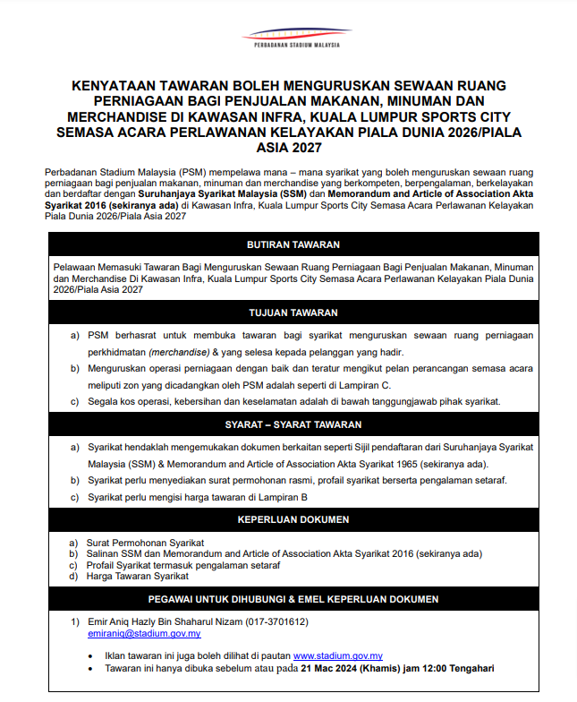 KENYATAAN TAWARAN BOLEH MENGURUSKAN SEWAAN RUANG PERNIAGAAN BAGI PENJUALAN MAKANAN, MINUMAN DAN MERCHANDISE DI KAWASAN INFRA, KUALA LUMPUR SPORTS CITY SEMASA ACARA PERLAWANAN KELAYAKAN PIALA DUNIA 2026/PIALA ASIA 2027